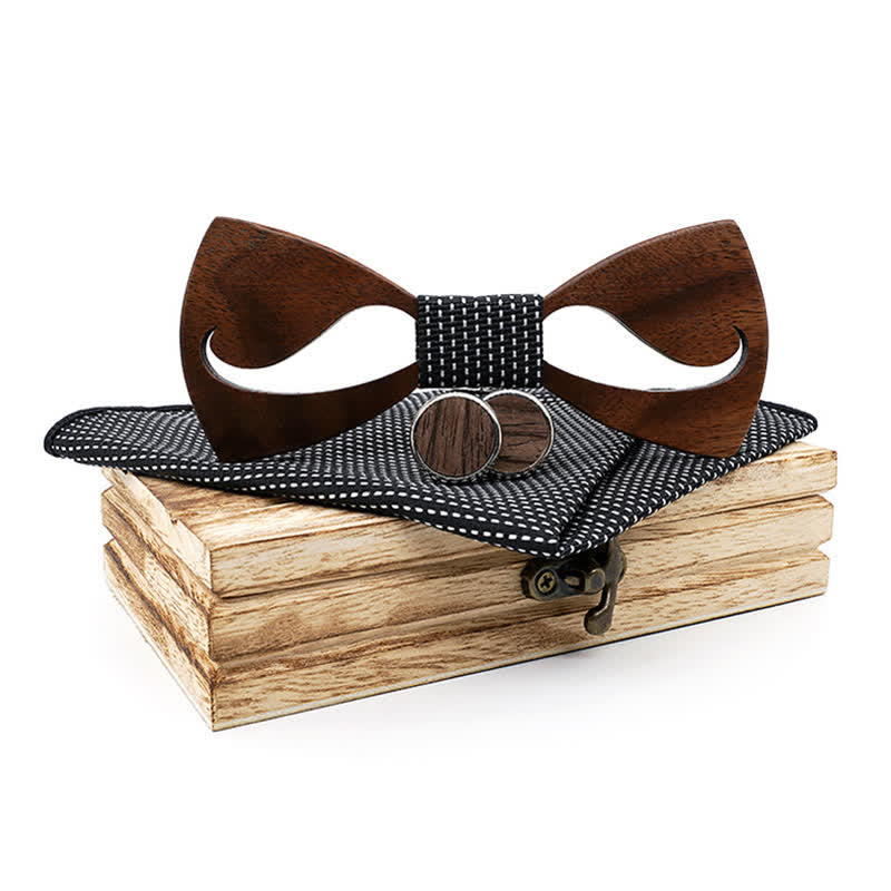 - The set is packaged in a rustic wooden box. A pocket square and cufflinks are included, the fabric matches the bow knot.