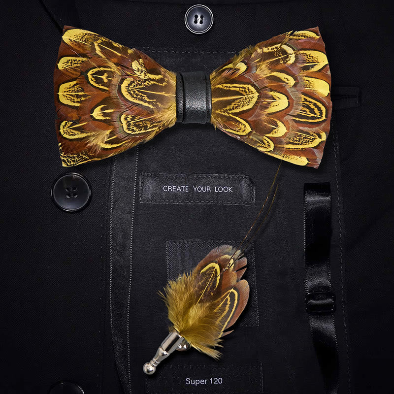 - Features: The pheasant feather bow tie combines varying shades of yellow, almond, and umber with hints of black. Layered with authentic pheasant feathers, this design is dapper with rustic appeal.